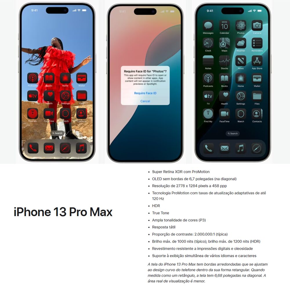 Tela Super Retina XDR de 6,1″ com ProMotion (até 120 Hz) para rolagem mais fluida e melhor resposta. Suporte Apple