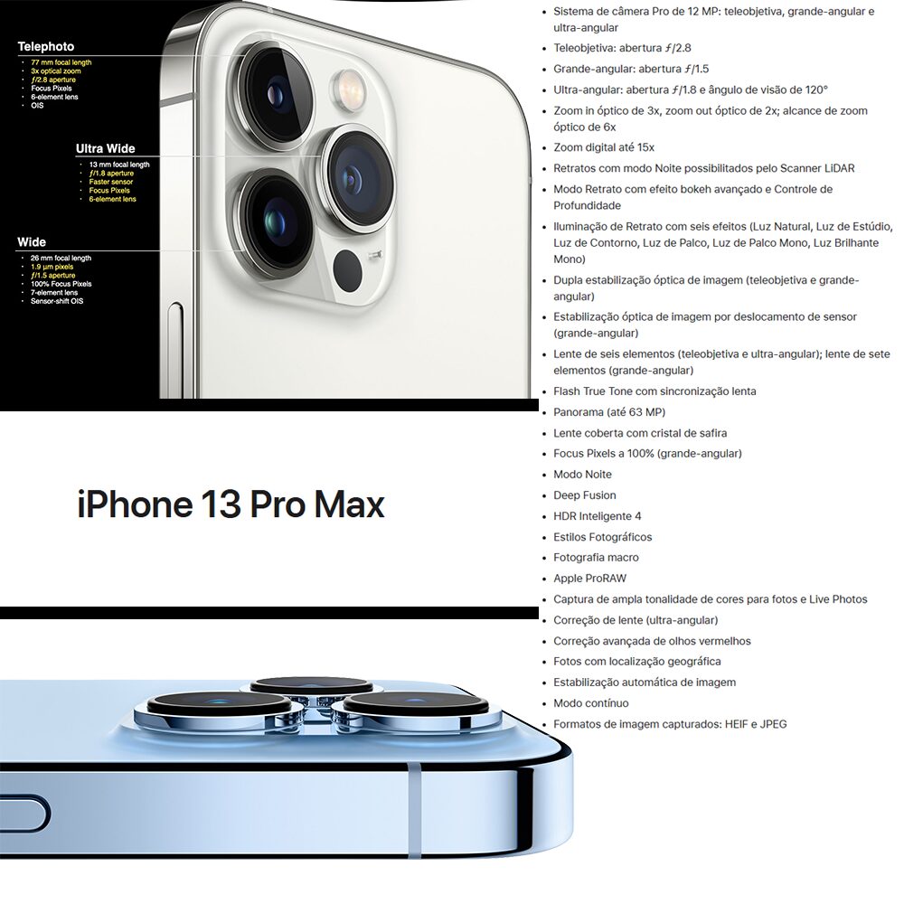 Tem sistema de três câmeras de 12 MP: telefoto, grande-angular e ultra-angular, com zoom óptico e ótimas capacidades para fotos e vídeos. Suporte Apple+1