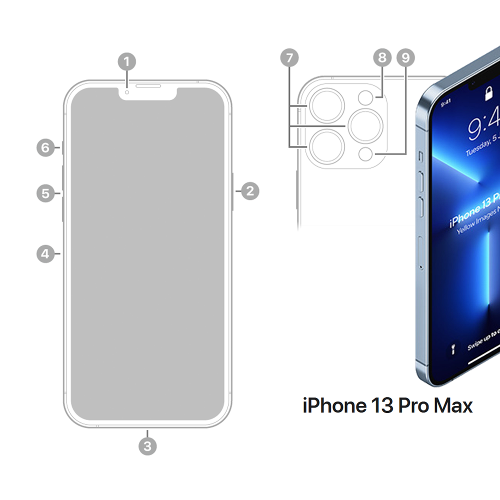 Ele tem frente em Ceramic Shield, parte de trás em vidro mate texturizado e armação em aço inoxidável. Suporte Apple