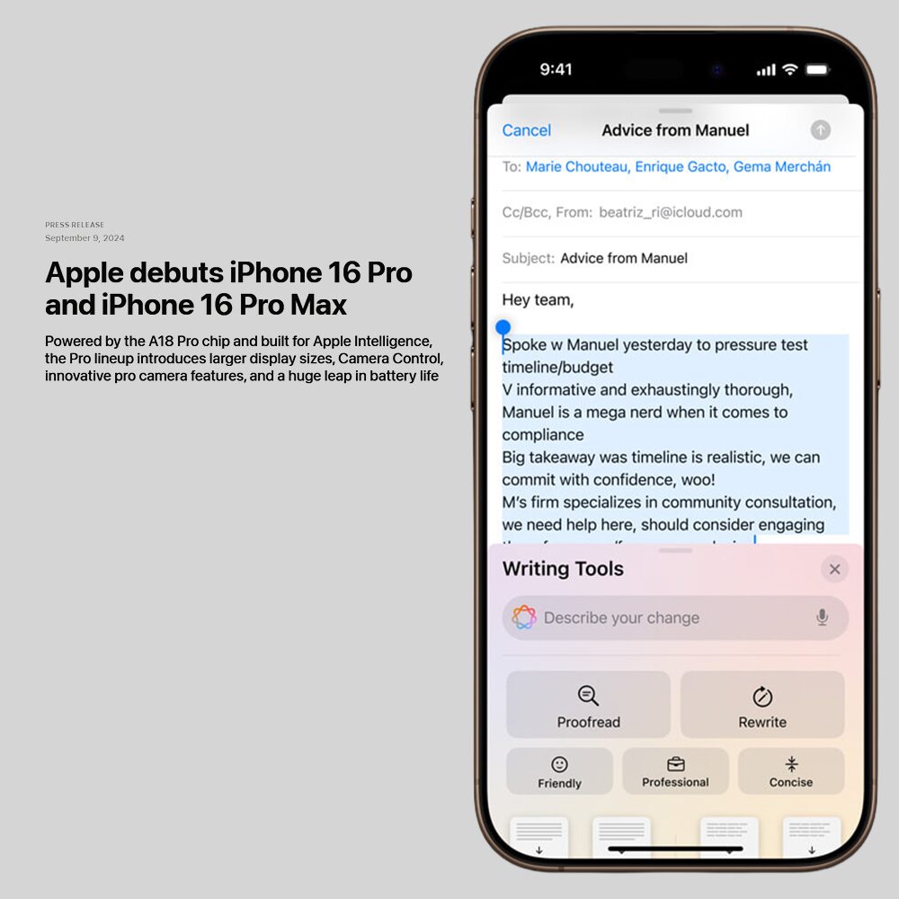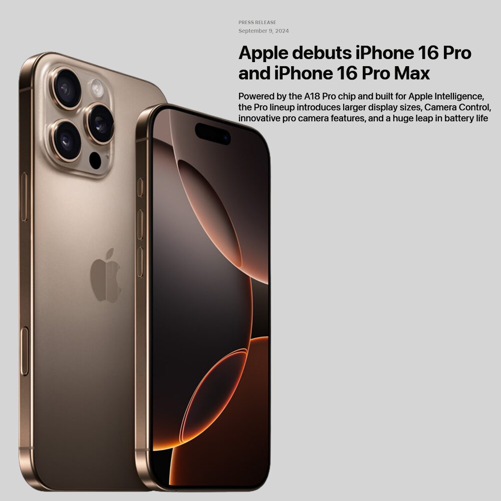 | Outros Recursos de Câmera | Controlo da câmera (“Camera Control”), Photonic Engine, Deep Fusion, Smart HDR 5, retratos, modo Noite, macro 48 MP, ProRAW, fotos espaciais, gravação 4K até 120 fps com Dolby Vision (Apple) |