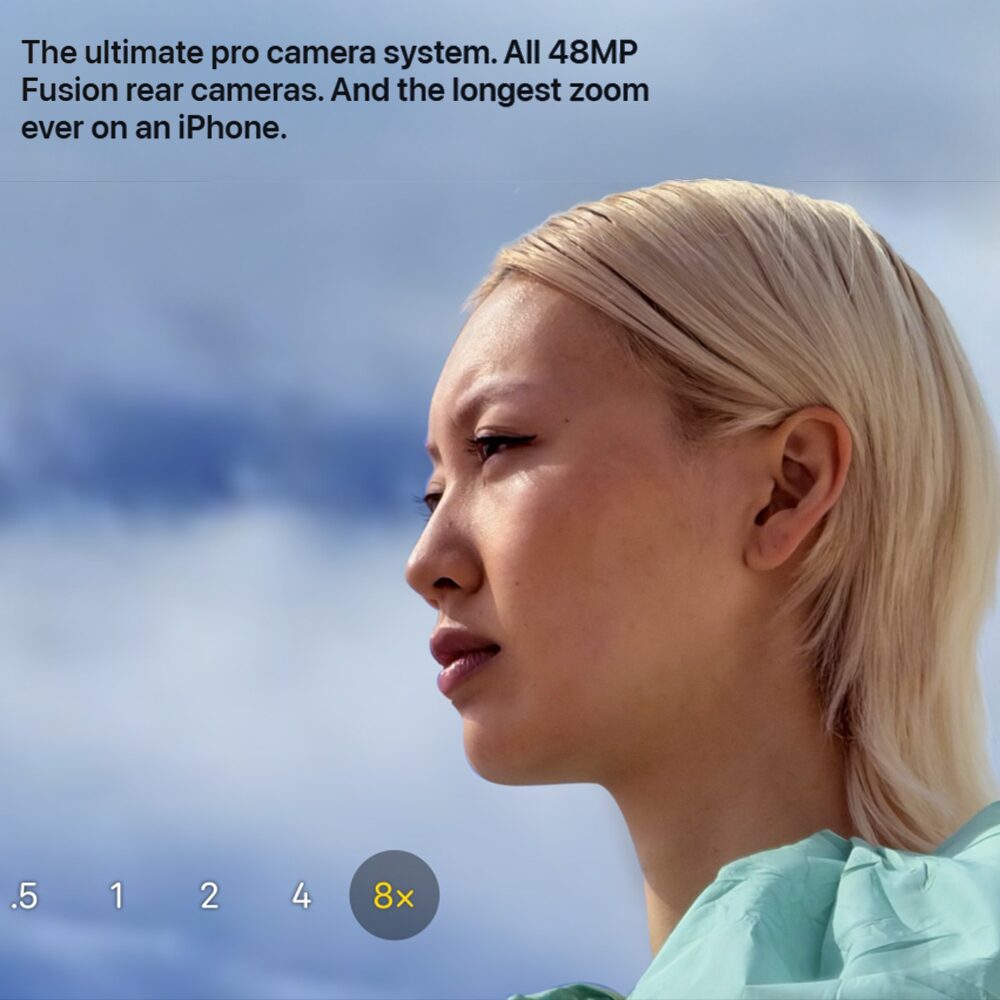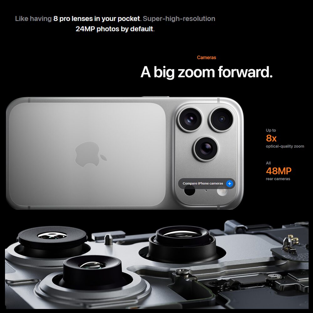 | Câmeras | Traseira: 48 MP (3 câmeras) com zoom óptico até 8× (MacRumors) Frontal: 18 MP Center Stage (Apple) |